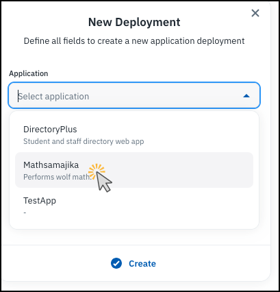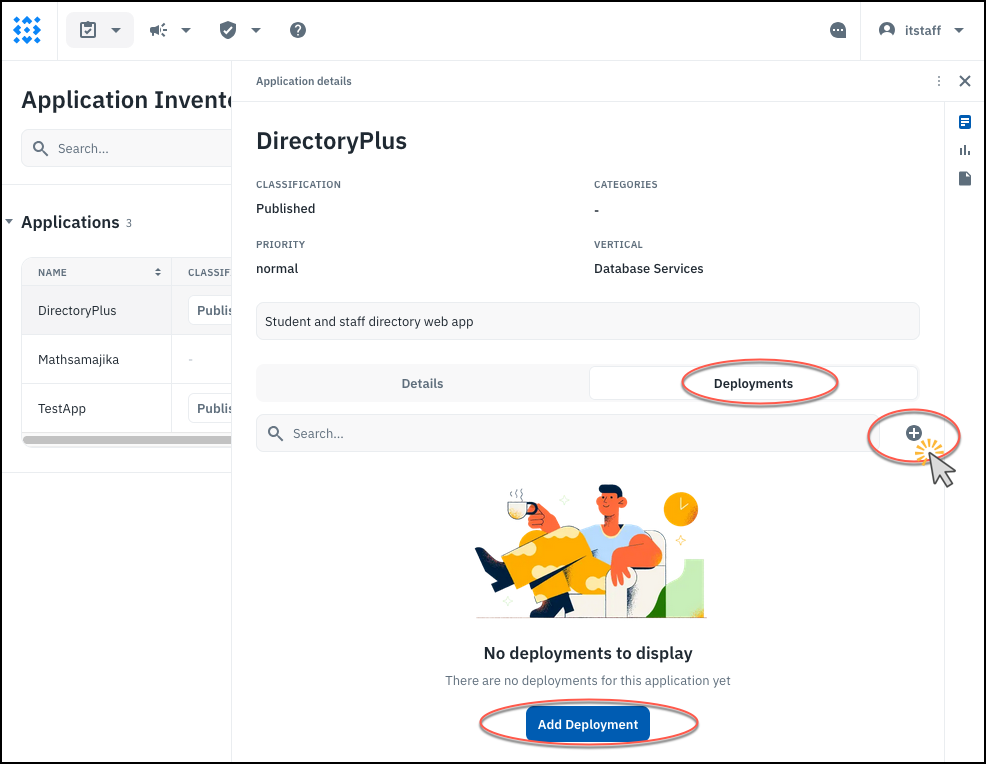 On the Application Details panel that opens up, go to the Deployments area and click the + sign to add a new deployment. (Or, click the Add Deployment bottom which shows if there are no deployments yet.)