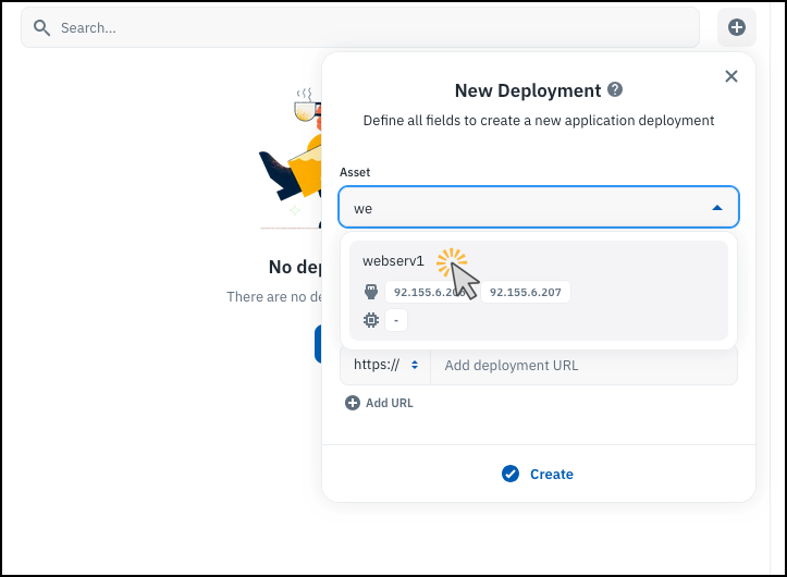 In the New Deployment dialog, you can search for an asset where you want to deploy by typing its name, IP address, or MAC address.
