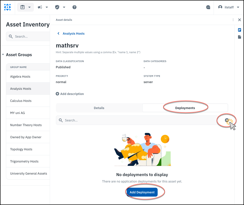You must be a superuser, Assessment Manager or IT Staff of the unit that owns the application, or the application owner, to create an application deployment. Additionally, you must have access to the asset where you want to deploy it.